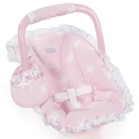 Переноска для кукол из серии "Карлота" розового цвета с белыми звездочками, оборудована жесткой ручкой и ремнями безопасности. В комплекте слюнявчик для куклы. Идеально подходит для путешествий на автомобиле.