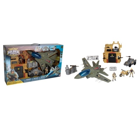 В комплекте: самолет (42см.), джип (20 см.), мотоцикл (12 см.), фигурка (10 см.), оборонительное сооружение, аксессуары.