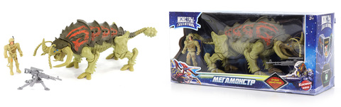 В наборе: фигурка Мегамонстра 34 см, фигурка солдата 10 см с подвижными руками, ногами и головой, станковый пулемет. У монстра подвижные конечности и бивни. Пулемет свободно вращается на станке, пулеметная лента подвижна. Фигурки сделаны из гибкого пластика, конечности не сломаются даже при самой активной игре.