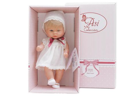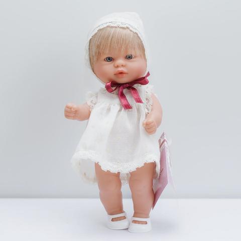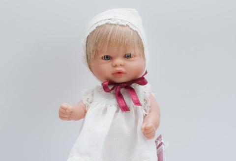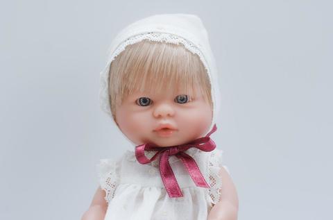 Эта очаровательная куколка с короткими светлыми волосами настоящая модница, ведь у нее такое красивое светлое платьице, украшенное декоративным кружевом и дополненное чепчиком в тон. А еще игрушка необычайно реалистично выглядит, поэтому ее даже можно спутать с настоящей маленькой девочкой.