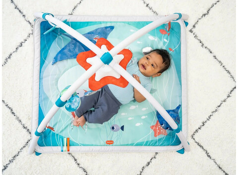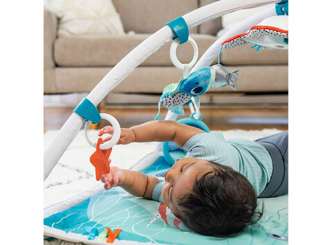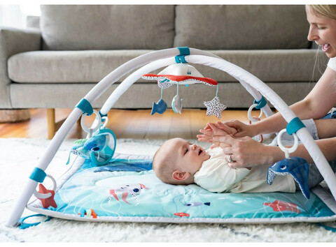 Это целый комплекс развивающих игрушек, который способствует гармоничному физическому развитию ребенка, а также помогает тренировать зрительное, тактильное и слуховое восприятие. Съемные дуги регулируются по высоте, позволяя адаптировать их под разные активности.