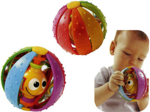 Погремушка - это яркий шар с раскрывающимися дольками. Всего в игрушке 8 разноцветных долек. Внутри дольки с зеркальной поверхностью, а снаружи - имеют пупырчатую поверхность для развития тактильных ощущений у малышей и массажа пальчиков. Внутри шара спрятался веселый червячок, который звенит, если потрясти погремушку.