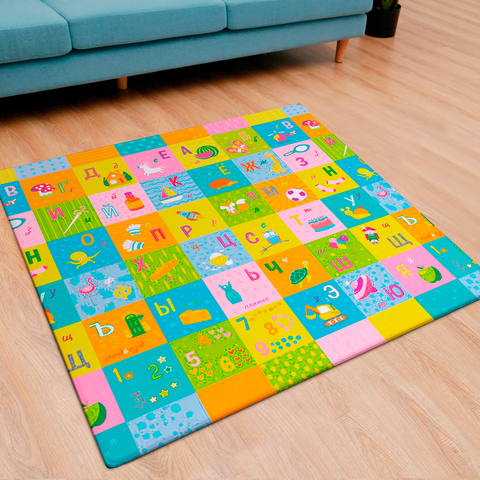 Маленький детский двусторонний ковер с красочными и "пастельными" рисунками которые развивают воображение и помогают во время игры изучать русские буквы.