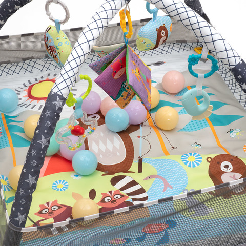 • Две игровых дуги с 5 съемными игрушками (3 пластиковых погремушки, безопасное зеркальце и яркая шуршащая с изображениями животных книжечка с пищалкой);