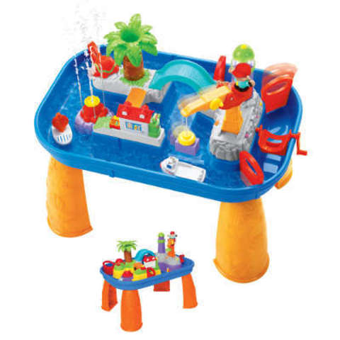 Замечательный центр. Удобен в перевозке, ножки снимаются и все детали тоже. Брать можно на дачу. Сам центр очень прочный. Маяк издает реалистичные звуки и голоса чаек,еще и светится как настоящий,а если нажать на него,то появится фонтан с высокой струей. Рядом с пальмой сидит черепашка-ковшик,которой можно наливать воду на пальму и там начинает крутиться колесо,выталкивая воду. Есть еще много итересного. Эта игрушка отличный подарок!