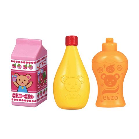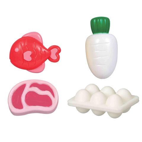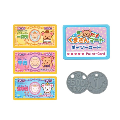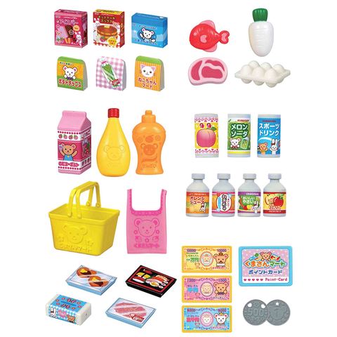 В комплекте: игровой коврик, имитирующий интерьер супермаркета, кассовый аппарат на прилавке, стойка с полками, корзинка для покупок, сумка для покупок, 9 продуктов, 2 монеты, 3 карточки, стикеры.