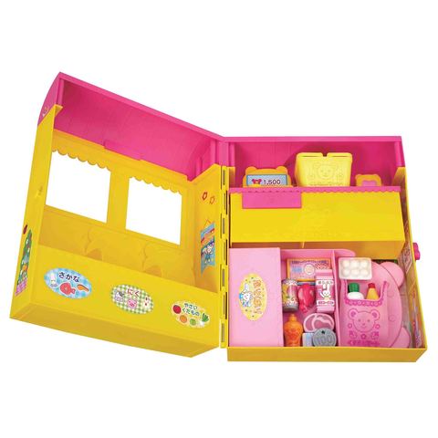 Супермаркет состоит из 2х модулей: разверните его, чтобы "сходить за покупками", или закройте, чтобы увидеть фасад. Супермаркет имеет интерактивные функции: отделение для денег на кассе открывается со звуком при нажатии на кнопку, а сканер реалистично пикает, если на него положить покупку.