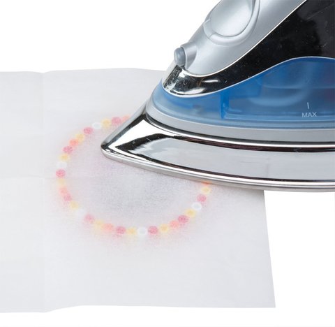 - Но для начала необходимо выложить на подставке из специальных термобусин выбранный узор, ориентируясь по схеме, а потом разместить на нем вощеную бумагу и прогреть с помощью утюга.