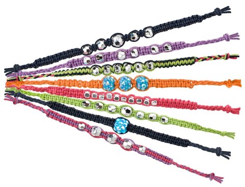 - В комплекте находятся аксессуары для создания стильных украшений, среди которых разноцветные атласные и нейлоновые шнурки, «драгоценные» камушки для украшения, металлические бусины для крепления и специальный крюк-держатель для плетения.
