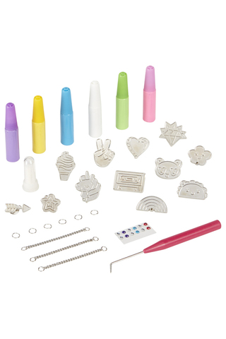 В комплекте: 2 металлических подвесок, 6 цветов эмалевых красок, инструмент для рисования цепочки, блеск, прыгающие кольца, стразы, инструкция.