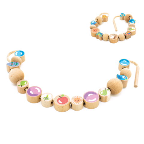 Шнуровка "Ассорти" в виде бус от бренда "МДИ" состоит из шнурка и 16 деревянных деталей, которые можно нанизать на веревочку в любом порядке.