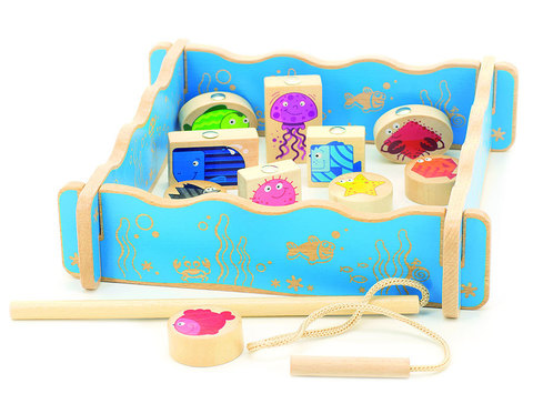 В набор входят удочка, фигурки рыбок и бассейн. Все предметы ярко окрашены, что порадует детей и придаст игре большую реалистичность. Цель игры - выловить всех морских животных из аквариума, используя удочку. Стилизованные рыбки прикрепляются к удочке при помощи встроенных магнитов.