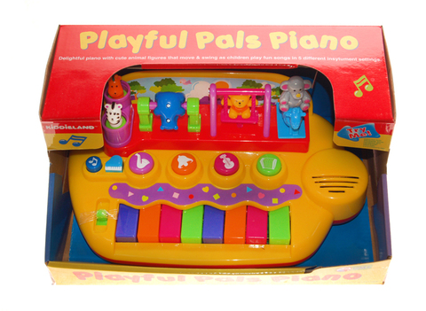 "Пианино с животными на качелях" снабжено 8 клавишами разных цветов, также имеются 4 кнопки, придающие игрушке звучание 4 разных инструментов. Также есть кнопочка с изображением нотки - при нажатии на нее начинают играть мелодии. Позади кнопок расположились зверушки на разнообразных качелях и качалках: лошадь, зебра, мишка, панда, слон. Когда играет музыка, они раскачиваются.
