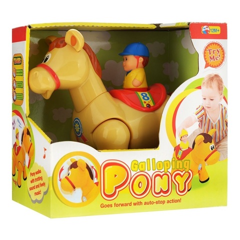 Пони может скакать вперёд, кивая головой, с забавными звуками и весёлой музыкой (слышится цокот копыт, ржание).