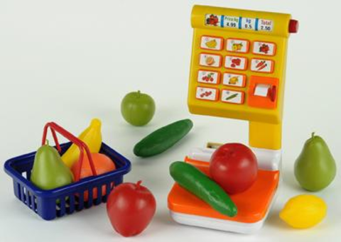 С помощью кнопочек можно выбрать нужное название товара. А на табло можно выбрать стоимость и вес продукта. Вы можете поиграть с ребенком, делая вид, что вы покупатель и собираетесь покупать какой-нибудь продукт.