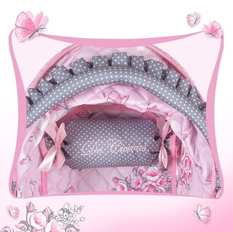 - Обивка коляски и входящие в комплект аксессуары выполнены в сочетании нежного розового и серого оттенков, украшены принтом с изображением бабочек и оборками.
