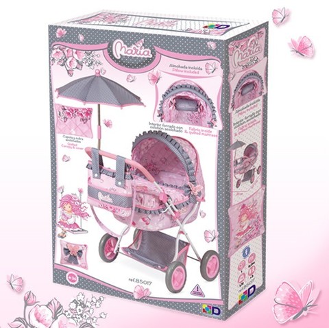 Такая коляска не оставит равнодушной ни одну "маленькую маму" и игра в "дочки-матери" станет еще более увлекательной. Изысканная отделка, нарядные детали (банты, рюши, кружева, помпоны), прорезиненные колеса, металлический каркас, складывающийся капюшон, под люлькой расположена сетка для вещей. Основной рисонок - девочка Мария на качелях.