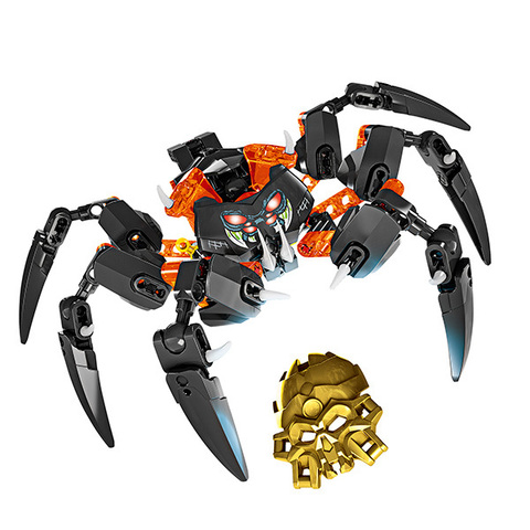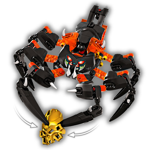 У Паучего Черепа есть секретная способность - стоит подойти близко, и она набросится на несчастную жертву, схватив мертвой хваткой! Нажми на рычажок сзади и его лапы с острыми когтями сомкнуться! Повелитель черепных пауков охраняет вход в древний город, расположенный в глубине джунглей. Чтобы пробраться туда, героям Bionicle придется победить этого опасного врага и забрать Золотую Маску Черепных Пауков, лишив армию чудовищ управления.