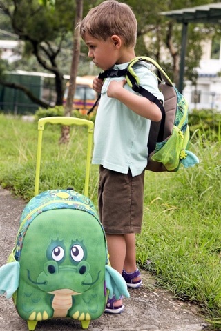 Для того чтобы кроха стал более ответственным и мог самостоятельно собрать свой багаж в дорогу - подарите ему стильную сумочку на колесиках, стилизованную под очаровательного зеленого дракончика. Сумочку можно легко катить, поэтому ребенок сможет отвечать за свои вещи сам.