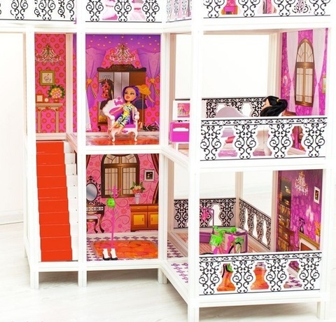 В доме 3 этажа свободной планировки, 2 балкона. На первом этаже можно разместить: ванную комнату, кухню, прихожую. На втором этаже – гостинную, гардеробную. На третьем – спальню. С первого на второй этаж куклы могут подняться по лестнице. На уровне 3-го этажа расположены два балкона. Для кукол 25-30 см.