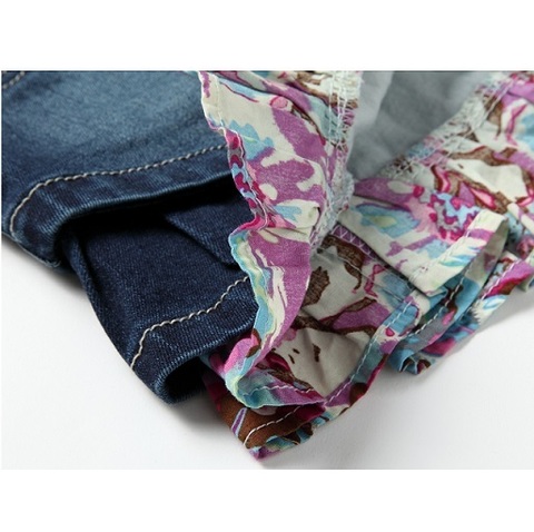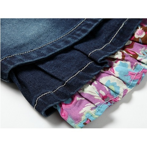 Джинсовая юбка с воланами. Нижний волан юбки из контрастной хлопковой принтованной ткани. Юбка имеет регулируемую резинку внутри пояса.