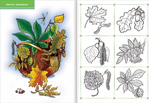 Справа на другой странице нарисованы те же растения, но не раскрашенные. На каждую черно-белую картинку нужно наложить цветную разрезную картинку с тем же растением. На обороте каждой картинки загадка о том, что на ней изображено.