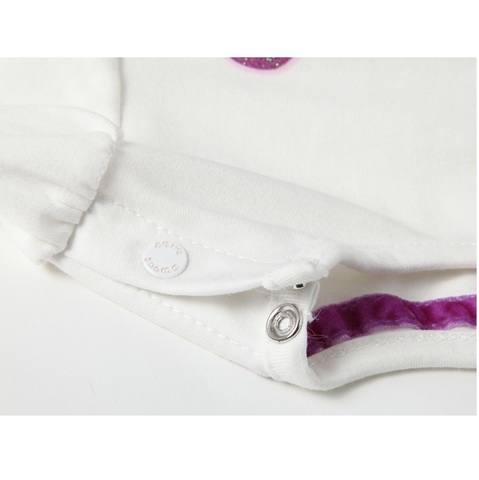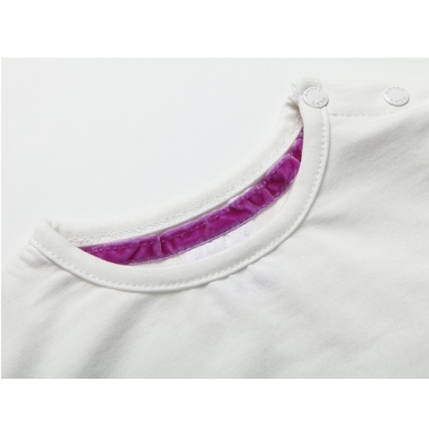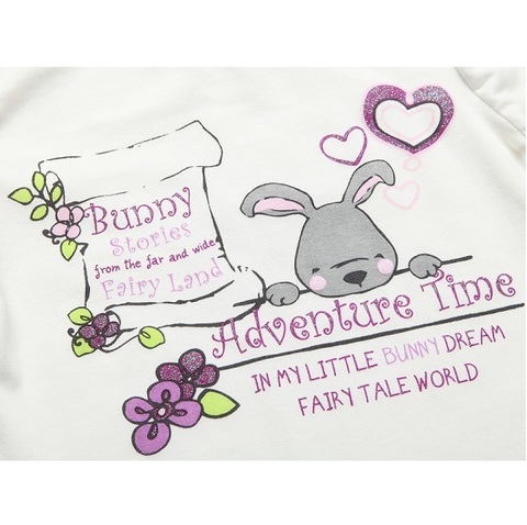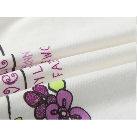 Футболка из мягкого трикотажа для девочки. Удобная застежка на плечевом шве. Декорирована модным принтом, дополненным блёстками.