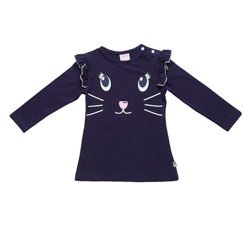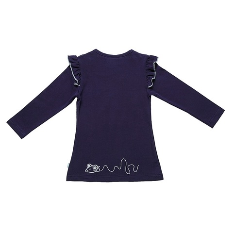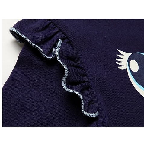 Комплект из 2-х предметов: платье и брюки. Платье украшено оригинальным принтом. На рукавах - мягкие воланы с контрастной отделкой. Застёжка на кнопки на плечевом шве. Трикотажные брюки на поясе с внутренней резинкой.