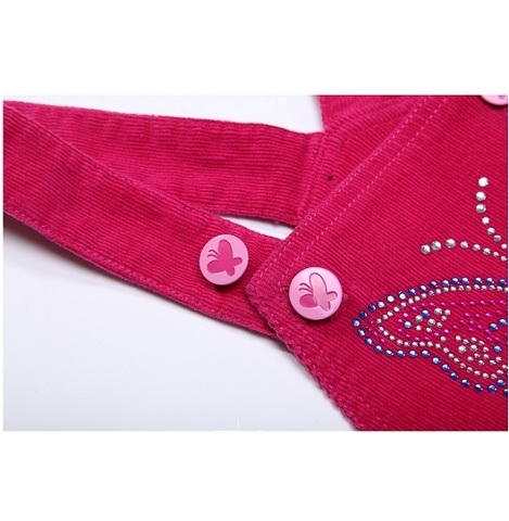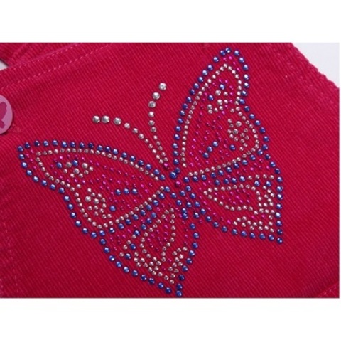 Яркий сарафан из вельвета. На переднем нагрудном кармане принт из страз в виде бабочки.