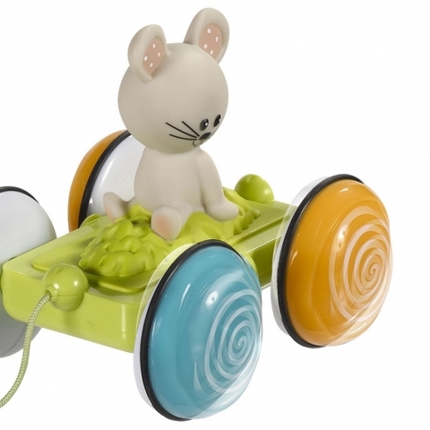 Каталка дочке понравилась. Животные из мягкого пластика, очень приятно держать в руке. Без запаха. Вагончики отсоединяются, их можно соединить в любом порядке. Жираф немного звенит при движении, котенок движется, а мышка же "шевелит" ушами.